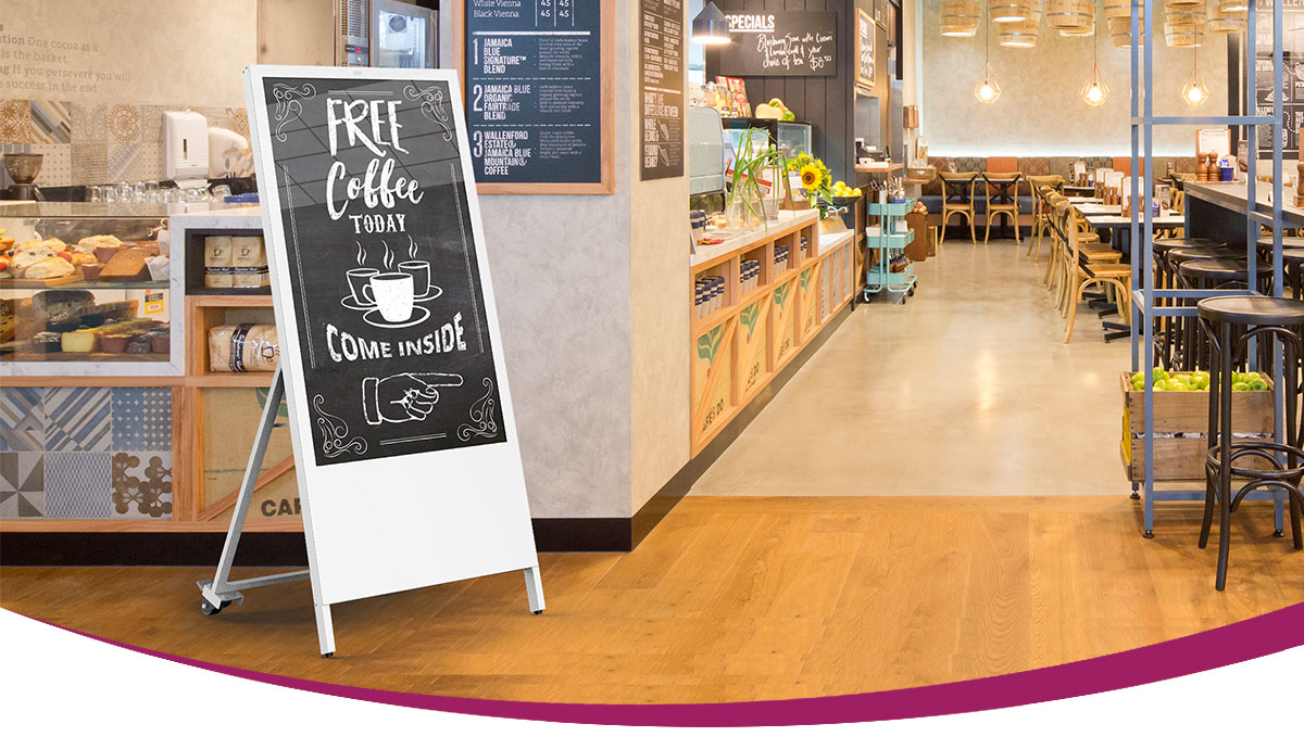 A Koiza Digital® apresenta o seu primeiro Display Digital Android A-Board a Bateria. Este display de sinalização digital móvel funciona sem cabo a partir de uma bateria recarregável embutida, pode ser colocado em qualquer lugar, para que possa chegar mais longe. Envolva e informe os seus clientes e o público-alvo usando texto, imagem e conteúdo de vídeo exibidos no monitor de alta definição de 49".